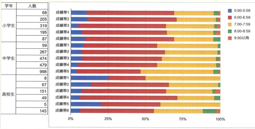 しかし、「早寝早起きをする生徒ほど成績上位層に多い」ことから早起きすることで勉強時間等を確保しつつ、効率よく時間を使えていることが考えられます。