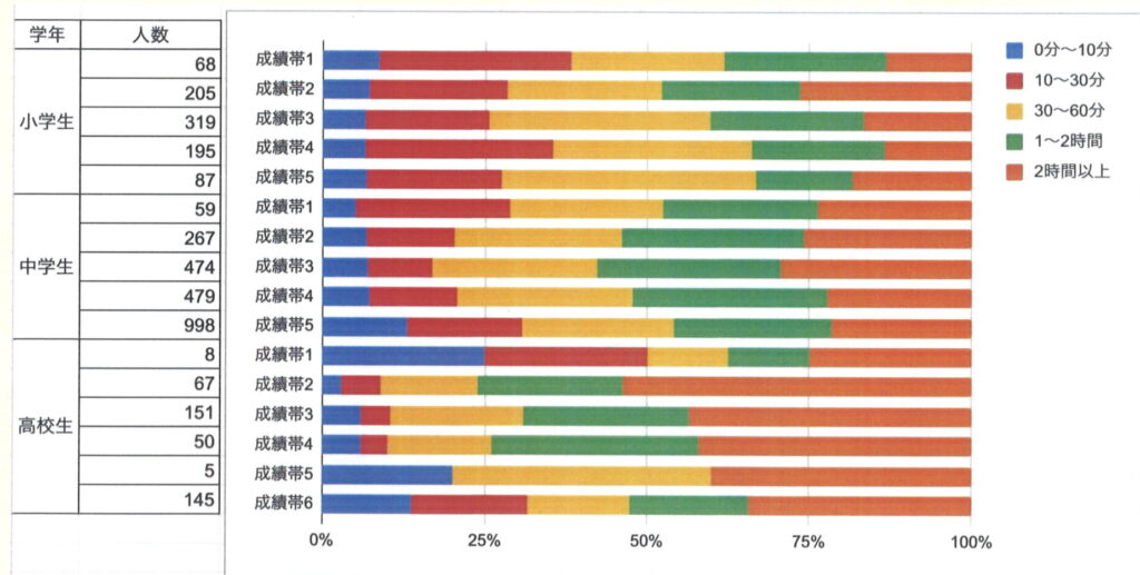 特に、中学生・高校生においてはこの傾向が顕著に現れています。中学生においては成績帯2~4の生徒の4分の1が2時間以上、半数以上が1時間以上費やしているのに対し、成績帯1と5の生徒の4分の1以上が30分以内に収まっています。