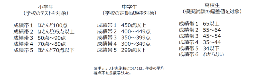 今回のアンケートにおいて、以下を成績帯として定義しました