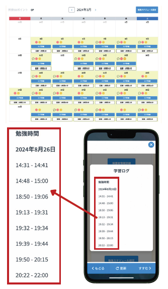 ヤルキプラスは、塾外での学習時間を可視化できるアプリケーションです。何時にどれくらい学習しているかがわかるため、深夜学習などが習慣化していれば保護者・生徒と共有し、生活の見直しをサポートします。
