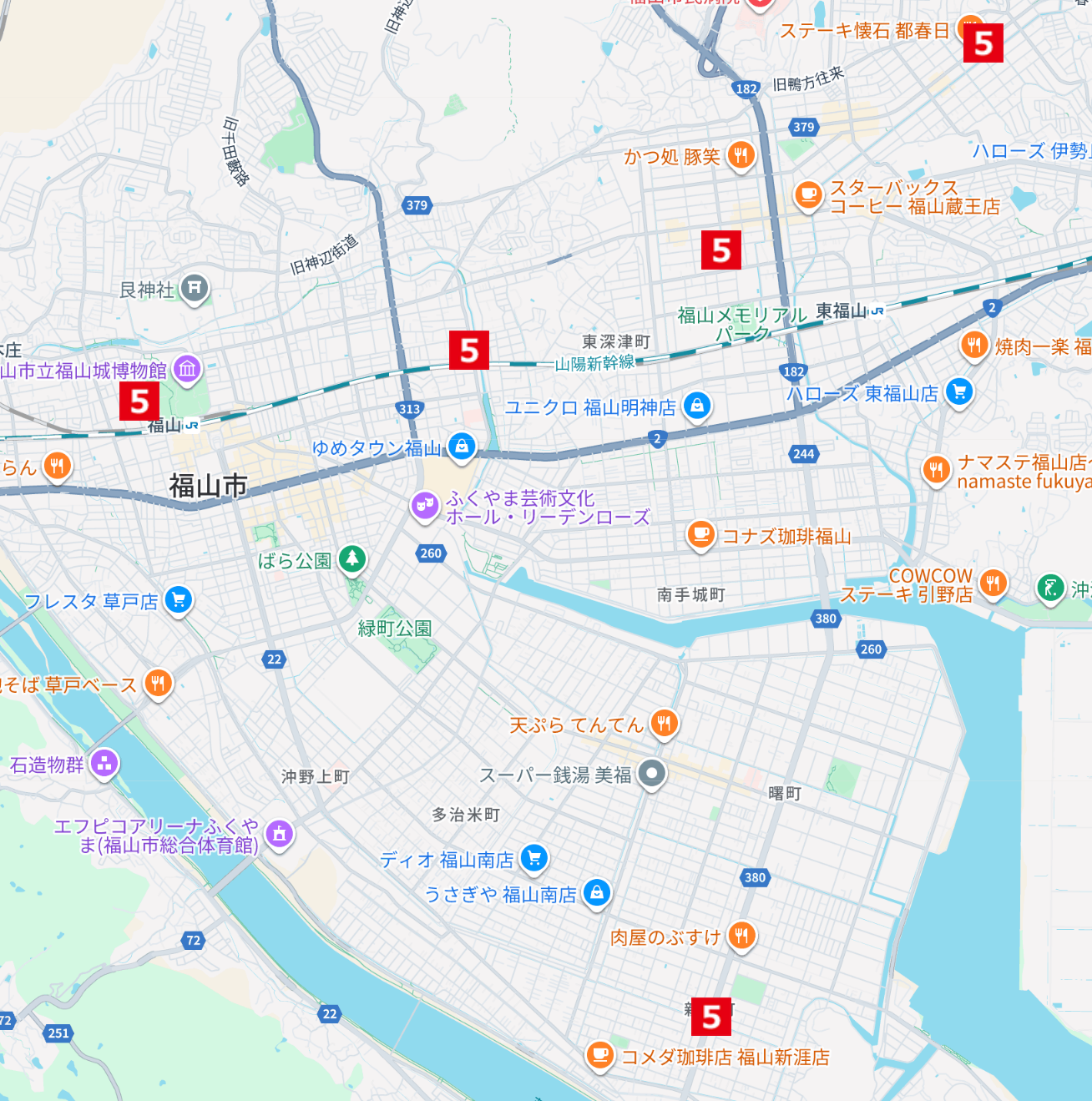 福山市内には 三吉校・西町校・福山春日校・新涯校・南蔵王校 の5校があり、それぞれの地域に合わせた校舎運営が行われています。