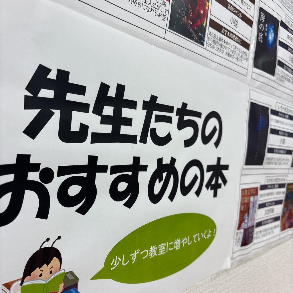 さらに、あえて子ども向けに縛らず、大学生スタッフのおさがりや教室長チョイスのおすすめ本を置いたり、スタッフが推薦する本の紹介を掲示したりするなど、幅広く読書へのきっかけ作りを提案しています。こうすることで、子どもは自分の興味に合った本を見つけやすくなり、読書の楽しさや学びへのモチベーションを自然に高めることができます。
