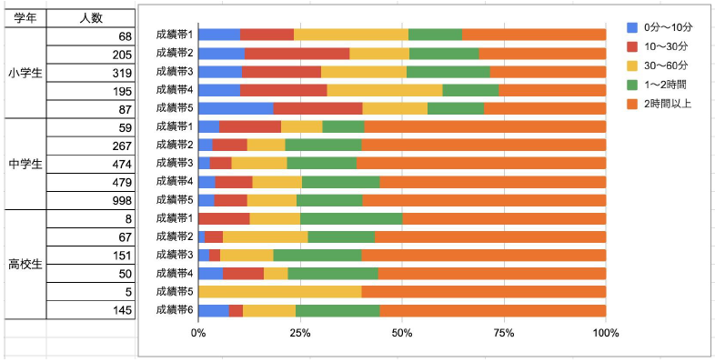 特に、小学生の成績帯1(最上位)のグループは、会話時間が「2時間以上」の割合が最も高く、。一方で、成績帯5(最下位)のグループは、会話時間が「0分~10分」の割合が高く、会話時間が短い傾向にあることがわかります。