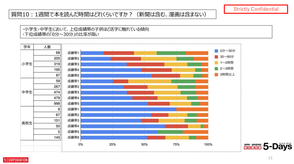 その中で、成績帯別の読書時間の結果は以下のようになりました。